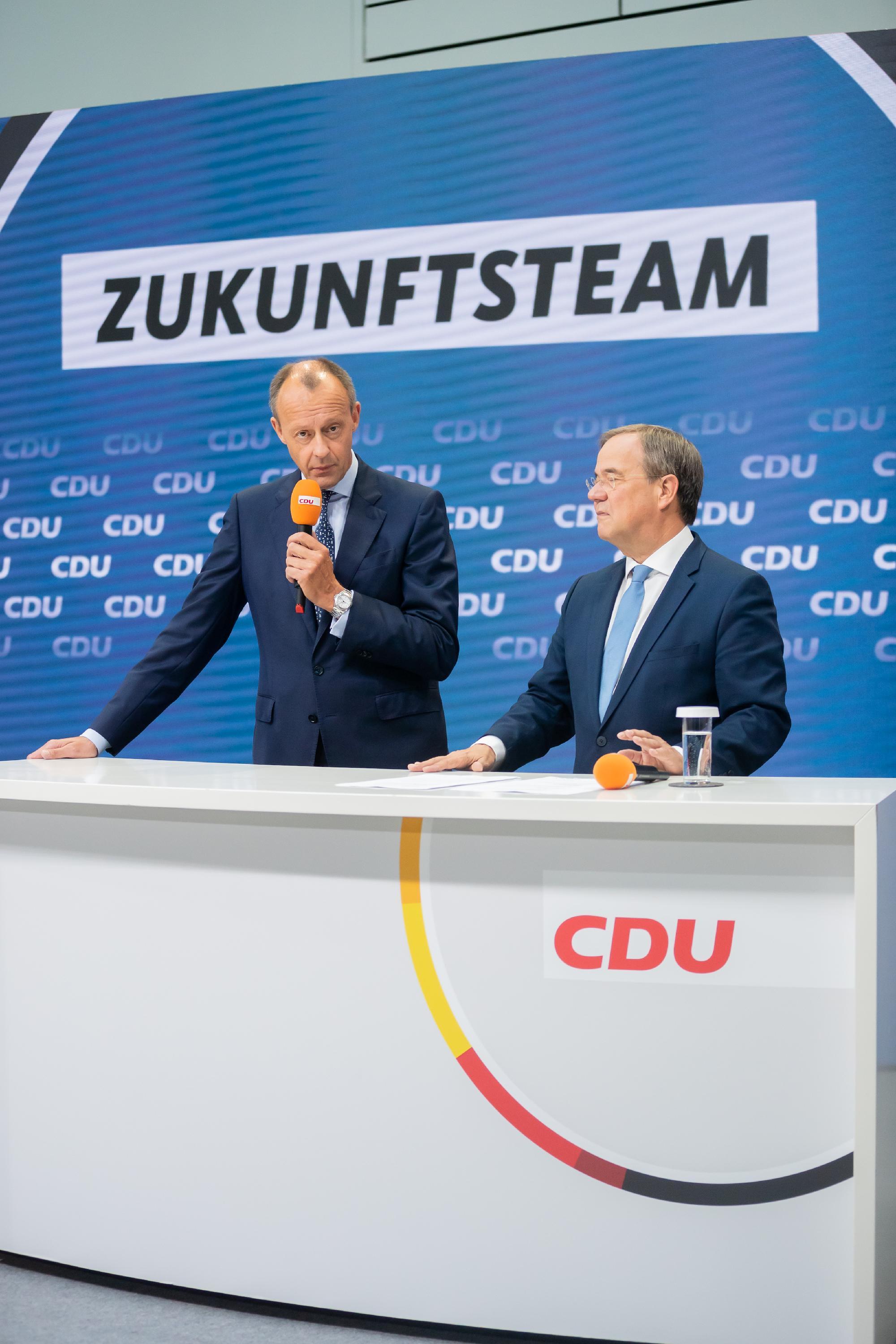 Friedrich Merz li bei der Vorstellung des Zukunftsteams von Unions-Kanzlerkandidat Armin Laschet. Kann Laschet mit seinem Zukunftsteam jetzt den Trend drehen. Laschet holt Merz und Bär. Mit Merz und einer Fränkin.